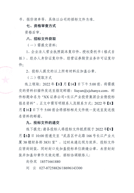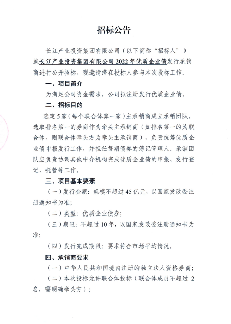 长江产业投资集团有限公司2022年优质企业债承销商招标公告