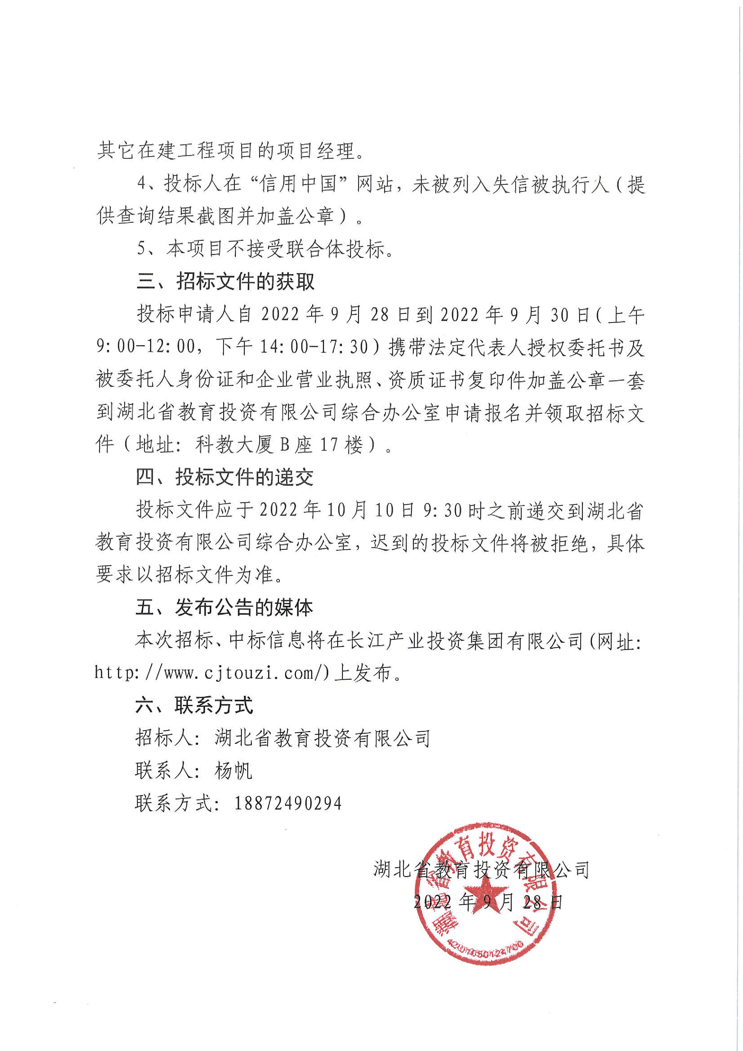 湖北省教育投资有限公司办公室装修工程施工招标公告