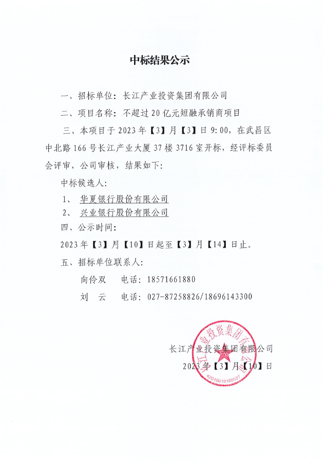 长江产业投资集团有限公司不超过20亿元短融承销商项目中标结果公示