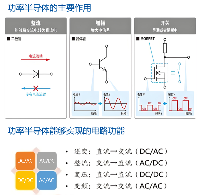 如图2所示,功率半导体作为半导体产业中至关重要的一类细分器件,其核心功能在于高效地处理电能,包括对电流、电压、频率、相位、相数等进行变换和控制,以实现整流(交流电到直流电,AC/DC)、逆变(直流电到交流电,DC/AC)、变压(直流电到直流电,DC/DC)、变频(交流电到交流电,AC/AC)、开关、放大等各种功能,是能耐高压或者能承受大电流的半导体分立器件、模块和集成电路。