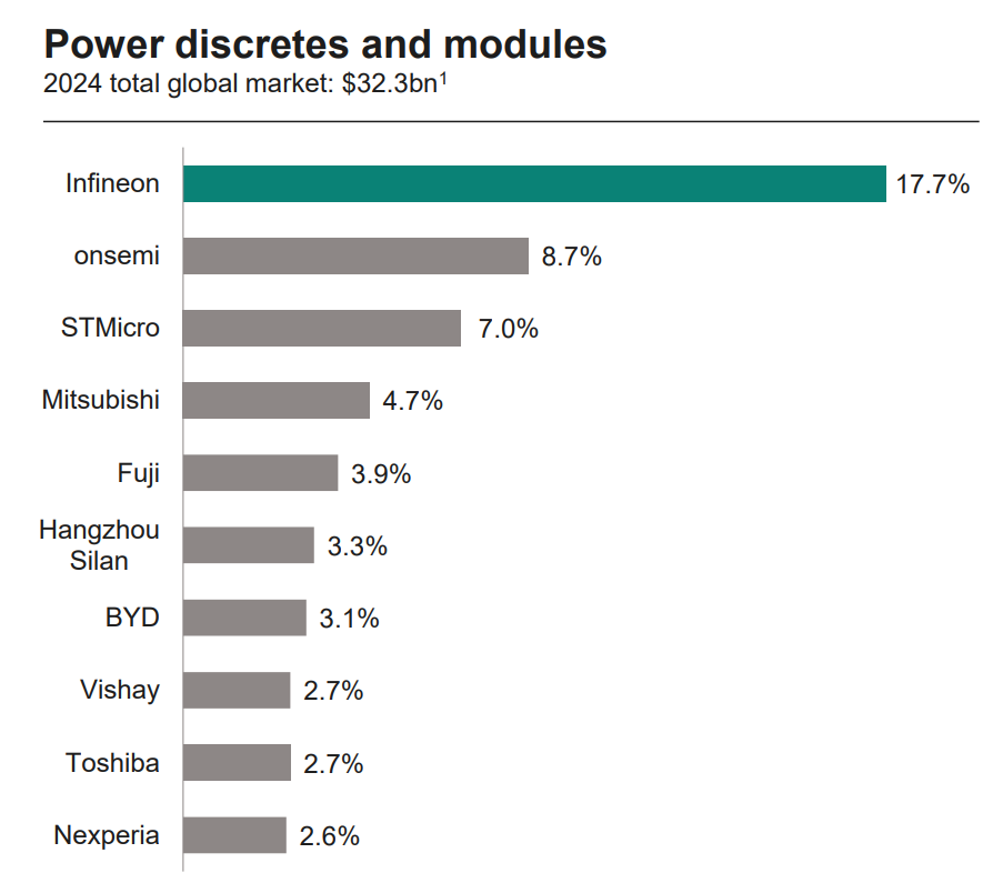 从大的行业来看,过去全球功率半导体市场一直稳中向好,但近期受下游应用市场疲软和库存调整的影响,市场有一定下滑。根据英飞凌2025年第二季度财报数据,功率半导体分立器件及模块市场规模从2023年的357亿美元下降至2024年的323亿美元,对应2,322亿元人民币。中国是全球功率半导体最大的消费国,占据了全球市场份额的34.5%,市场规模为801亿元。