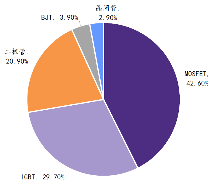 如图11所示,从功率半导体器件细分产品来看,市场对MOSFET、IGBT以及二极管需求较大。根据芯谋研究的数据,MOSFET占功率分立器件市场份额最大,达到42.6%,其次是IGBT和功率二极管,三者占据了90%以上的功率器件市场。