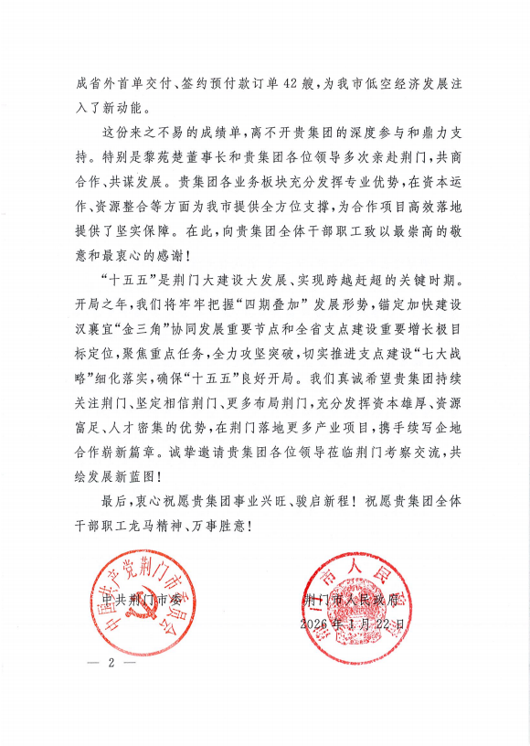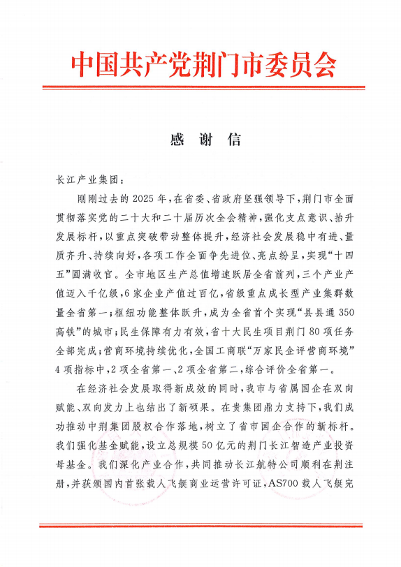 信中表示,过去的一年,荆门市与长江产业集团在双向赋能、双向发力上结出了新硕果。双方成功推动中荆集团股权合作落地,树立了省市国企合作的新标杆;强化基金赋能,双方合作设立总规模50亿元的荆门长江智能产业投资母基金;深化产业合作,共同推动长江航特公司顺利在荆注册,并获颁国内首张载人飞艇商业运营许可证,AS700载人飞艇完成省外首单交付、签约预付款订单42艘,实现了良好开局。