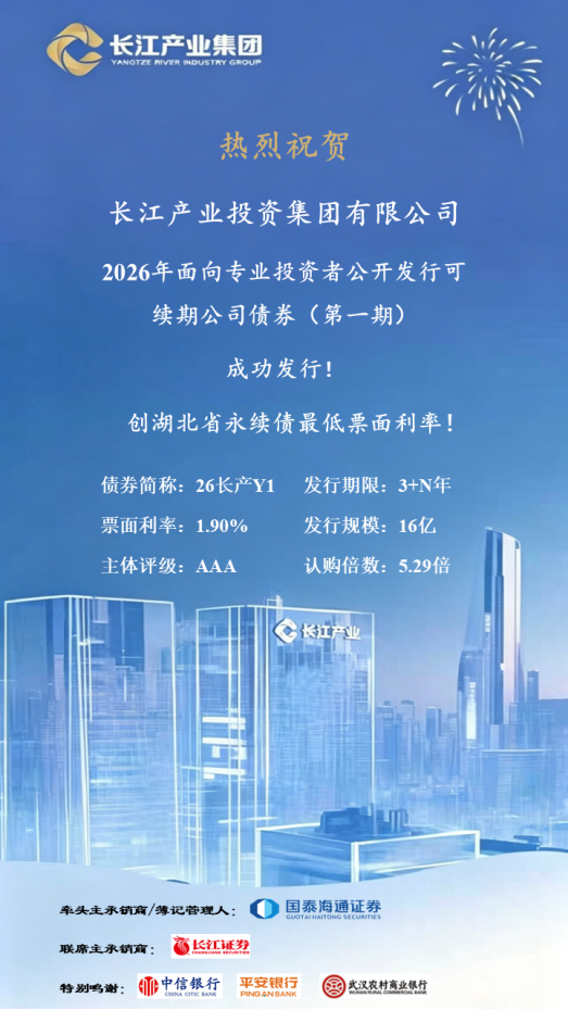 4月13日,长江产业集团成功发行2026年面向专业投资者公开发行可续期公司债券(第一期)(简称:26长产Y1,代码:244986),以1.90%的票面利率创下湖北省可续期公司债券历史最低利率,全场认购倍数达5.29倍。