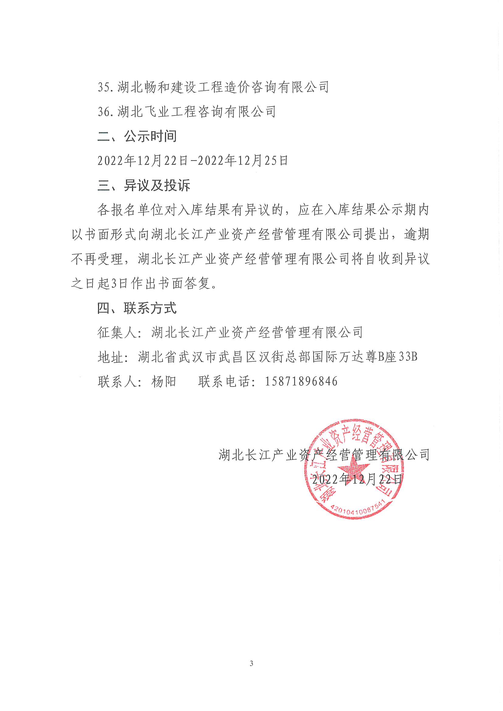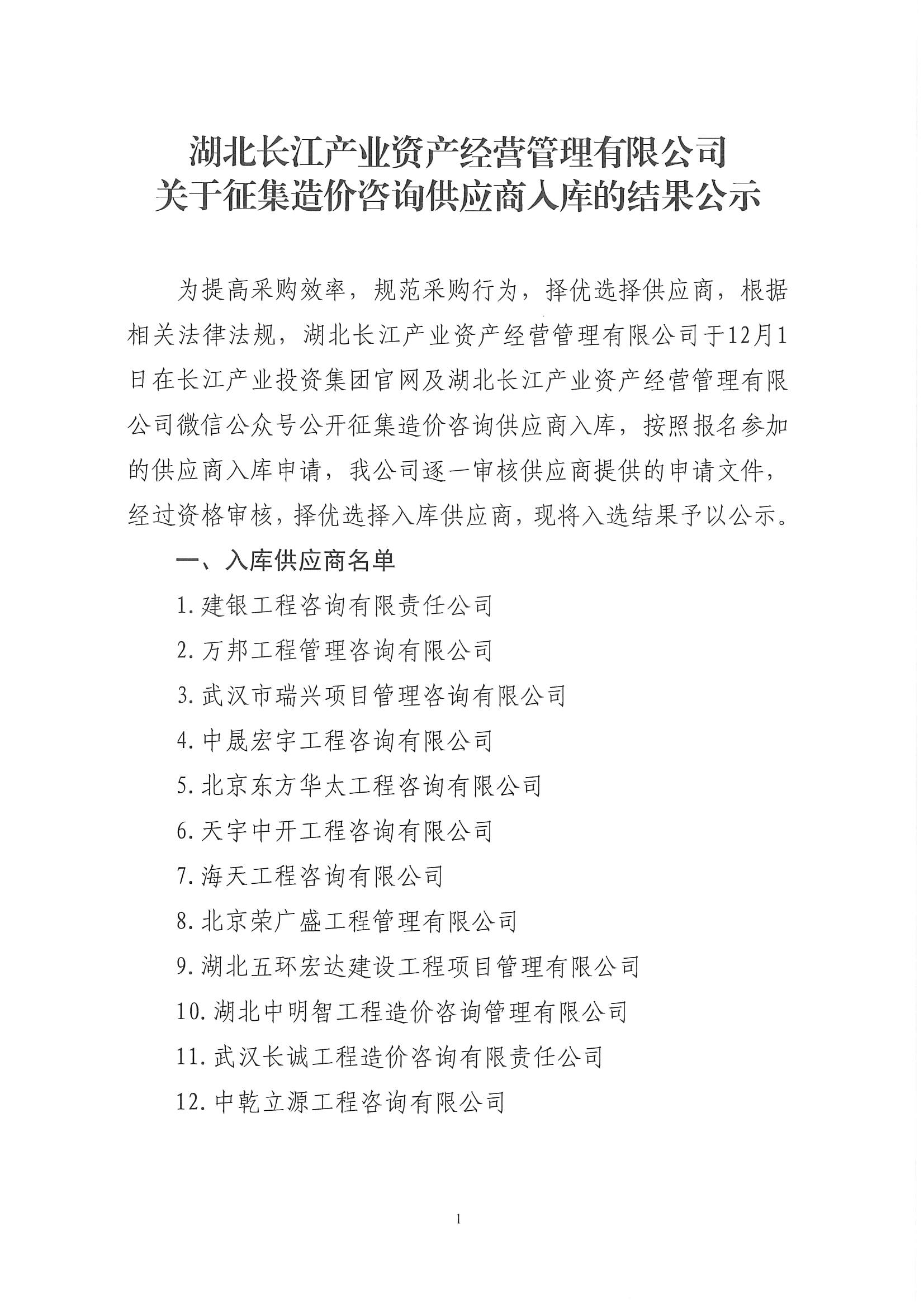 湖北长江产业资产经营管理有限公司关于征集造价咨询供应商入库的结果公示