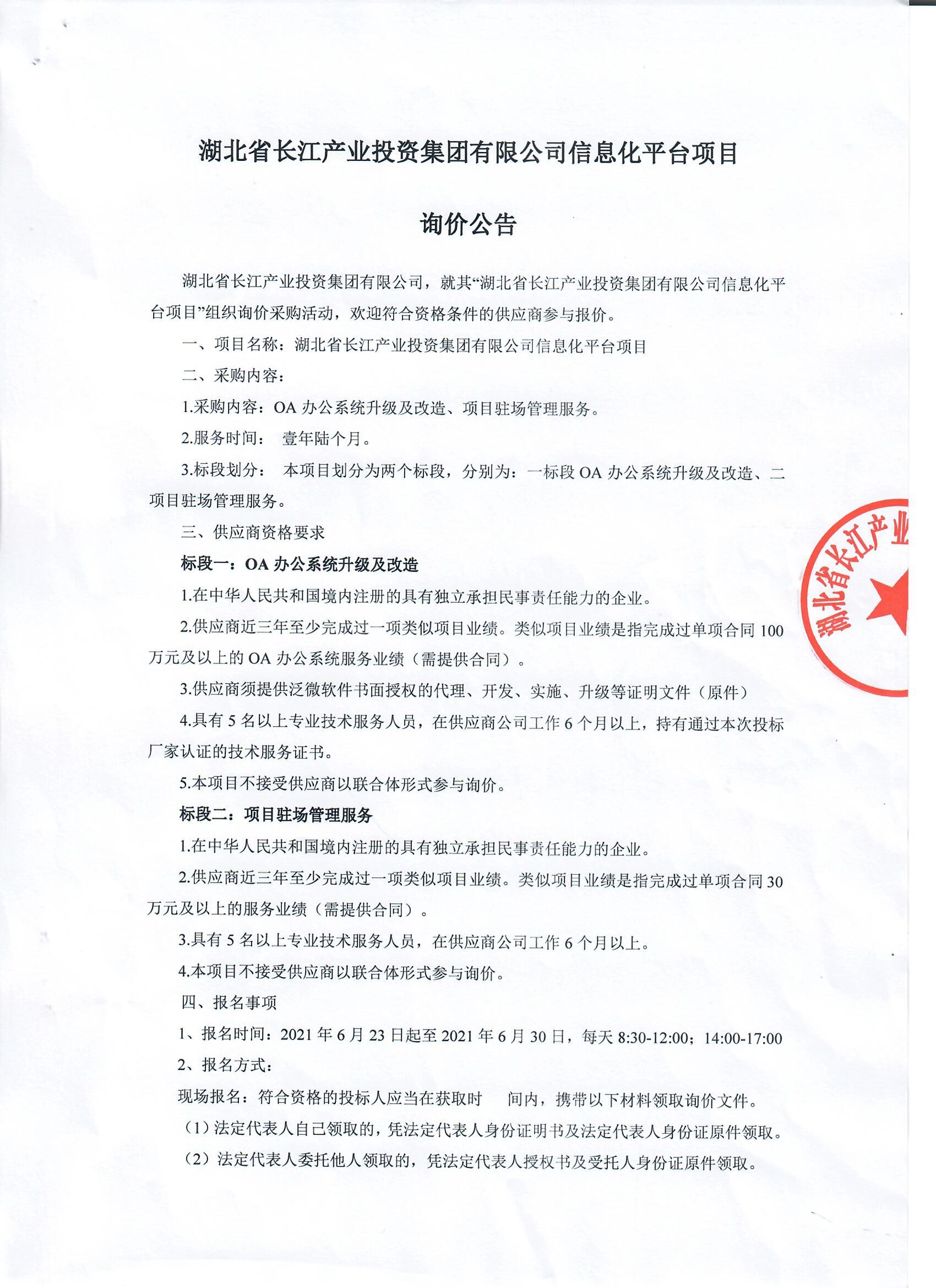 湖北省长江产业投资集团有限公司信息化平台项目询价公告