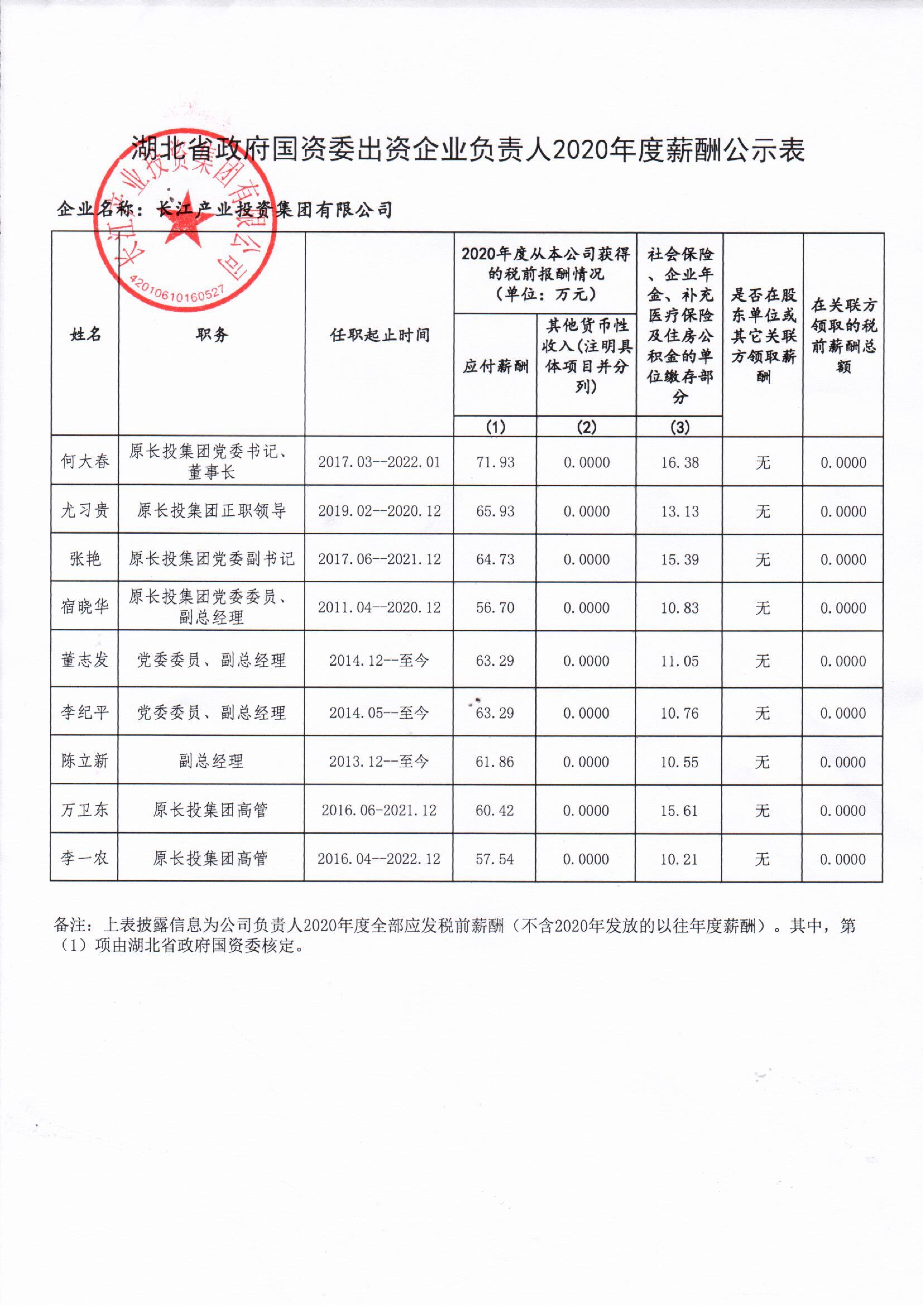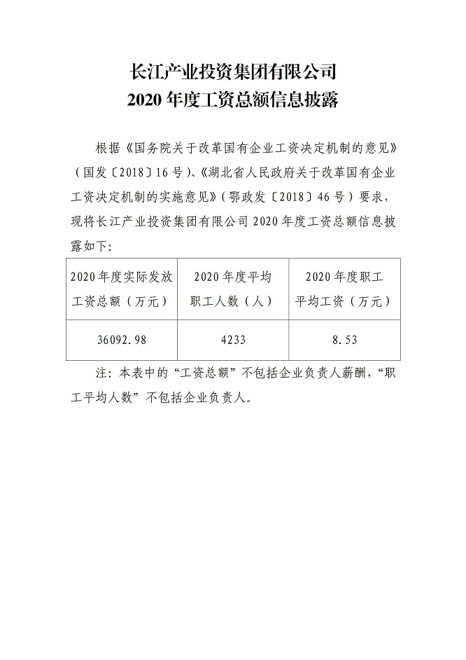 长江产业投资集团有限公司2020年度企业负责人薪酬公示及工资总额信息披露