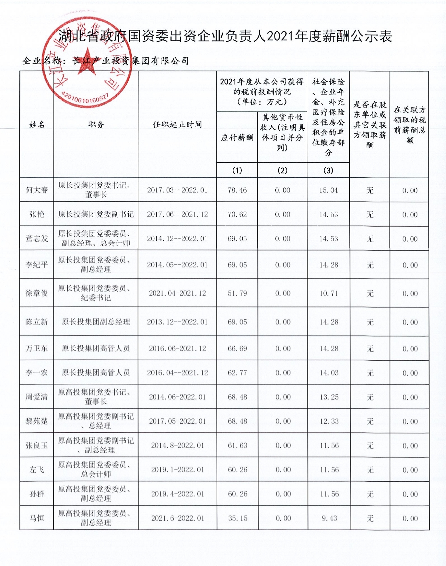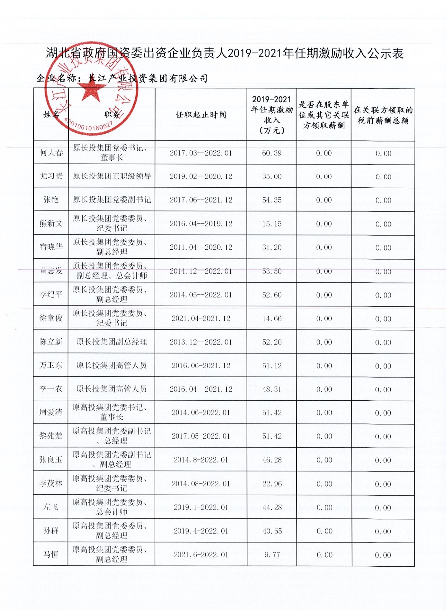 长江产业集团关于领导人员2021年度年薪及2019-2021年任期激励发放情况公示