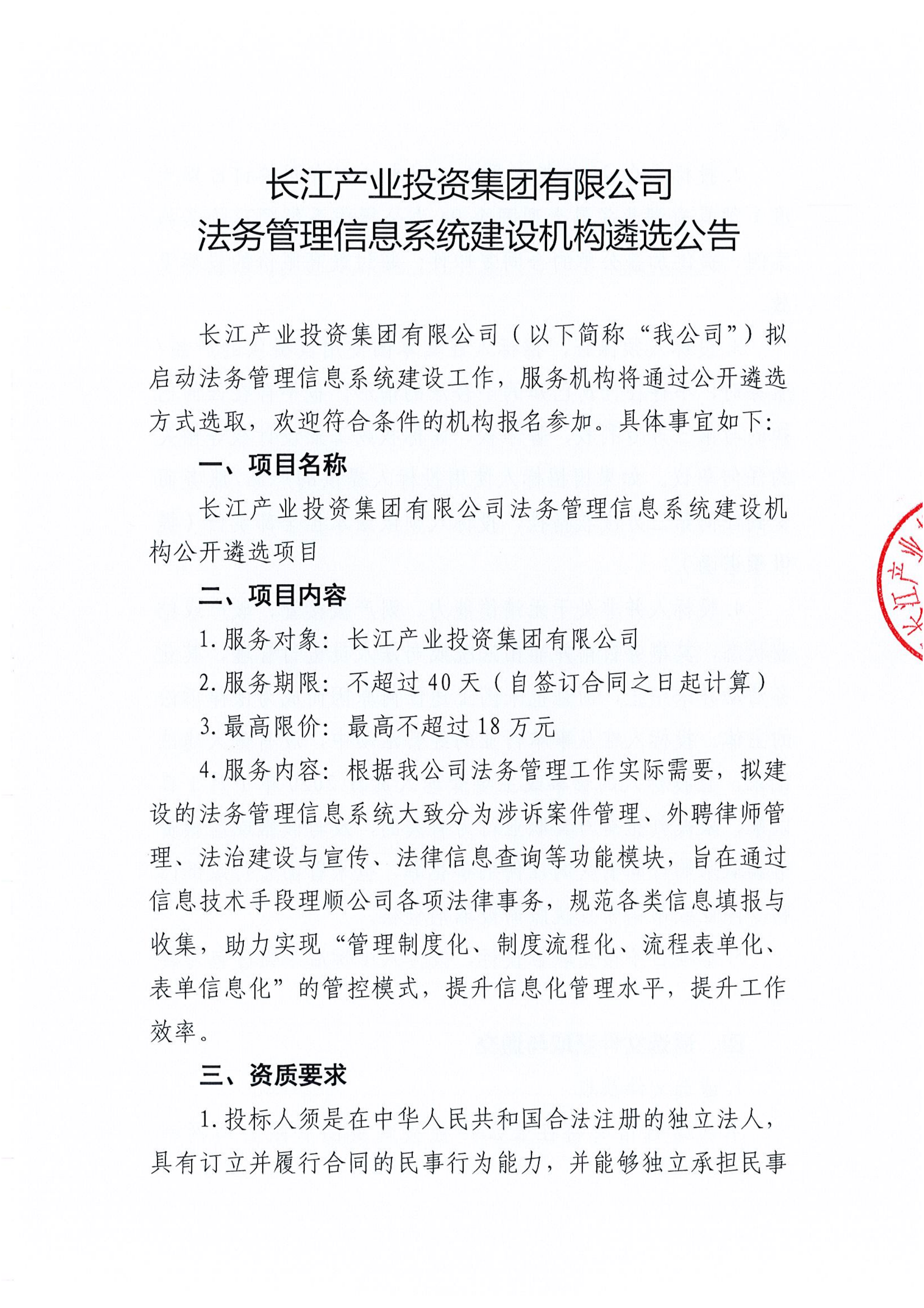 长江产业投资集团有限公司法务管理信息系统建设机构遴选公告