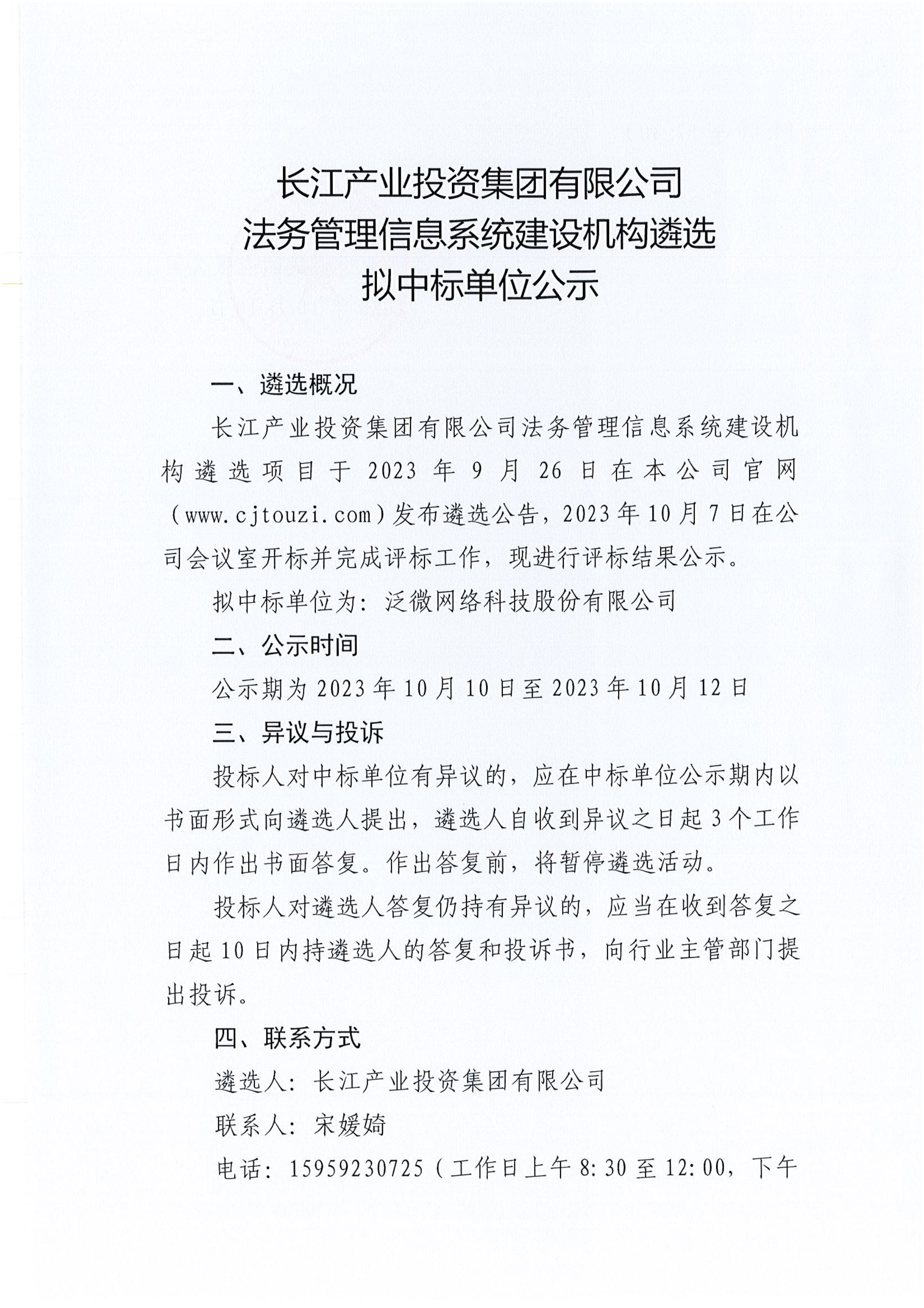 长江产业投资集团有限公司法务管理信息系统建设机构遴选拟中标单位公示