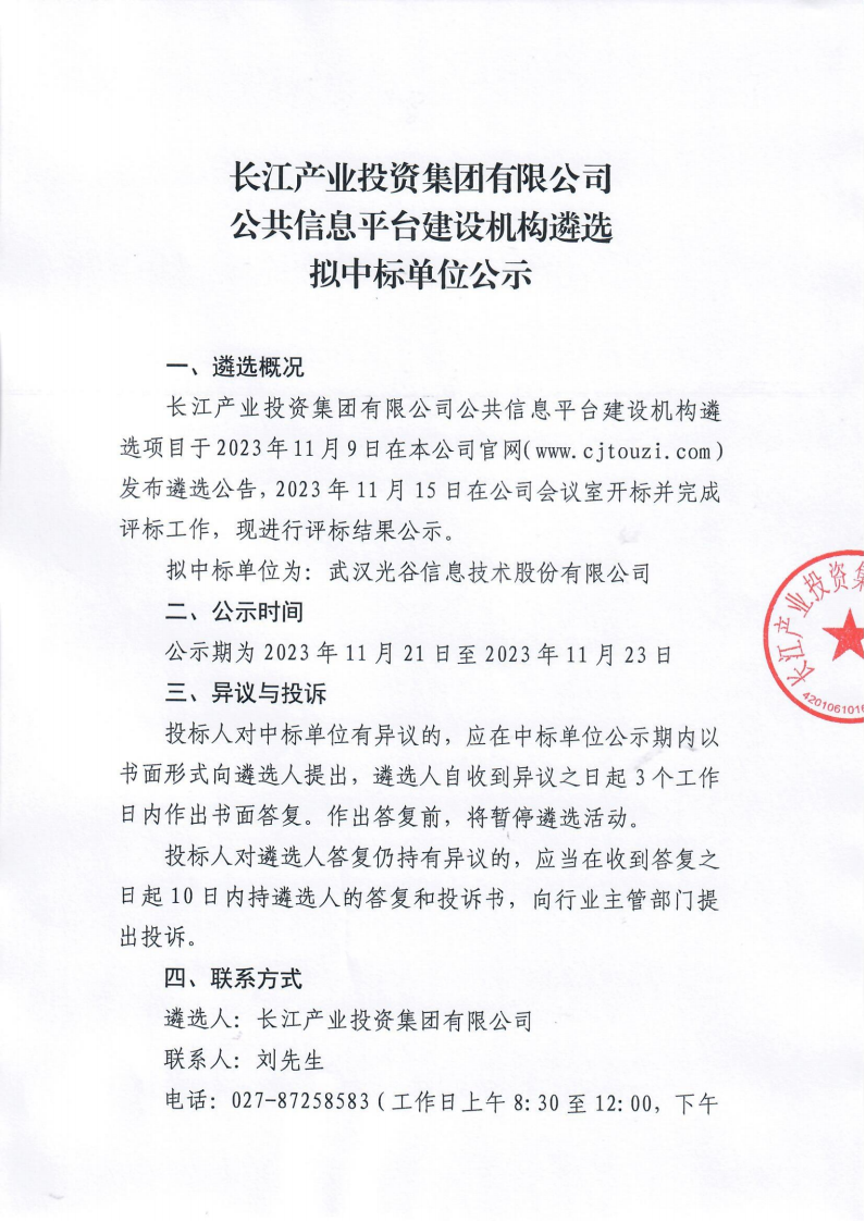 长江产业投资集团有限公司公共信息平台建设机构遴选拟中标单位公示