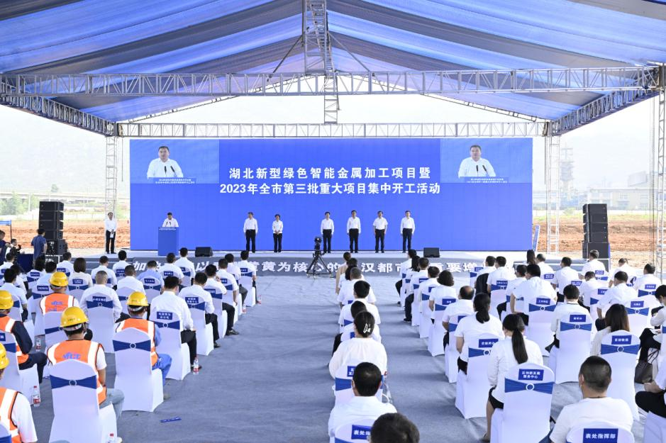 5月18日,在湖北新型绿色智能金属加工项目现场,黄石市组织视频连线收听收看2023年二季度全省重大项目集中开工活动,并举行湖北新型绿色智能金属加工项目暨2023年黄石市第三批重大项目集中开工活动。黄石市委书记郄英才出席并宣布集中开工,副书记、市长吴之凌,长江产业集团党委委员、副总经理董志发参加活动。