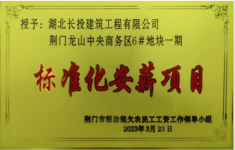 7月13日,长江投开下属长投建工承建的荆门龙山中央商务区6#地块一期项目荣获荆门市2023年“标准化安薪项目”。