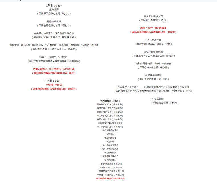 8月16日,湖北省档案局、湖北省档案馆印发了《关于全省“奋进新征程·兰台谱新篇”主题征文活动获奖情况的通报》,湖北典策档案科技发展有限公司荣获优秀组织奖,湖北典策员工荣获企业类二等奖、三等奖、优秀奖各一名。