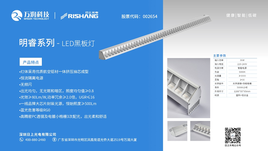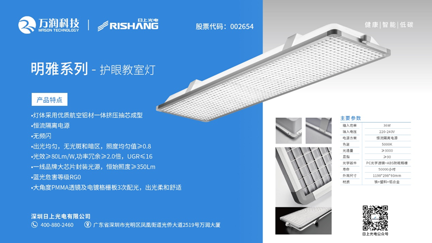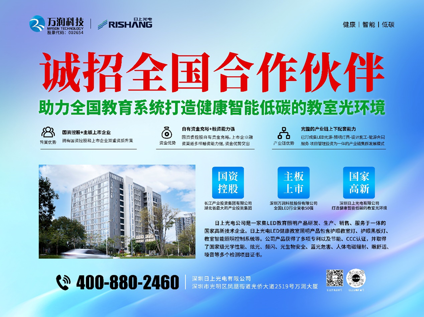 日上光电是万润科技(股票代码:002654)全资子公司,具有湖北国资控股和上市企业的双重资质背景,LED健康教室照明产品是日上光电重要业务版块之一。日上光电致力为全国各地教育系统提供最优质的产品及解决方案,为中小学生视力健康保驾护航。日上光电为客户提供方案设计、项目招标、项目实施、售后维护、资金授信等一站式服务解决方案。日上光电在四川、海南、北京、广东、江苏、河南等省市多次中标教室照明改造项目,成功改造逾千所学校的教室健康光环境,成功塑造了日上光电在教育照明细分领域的品牌影响力。本次展会上,日上光电教育照明产品面向全国招募合作伙伴!