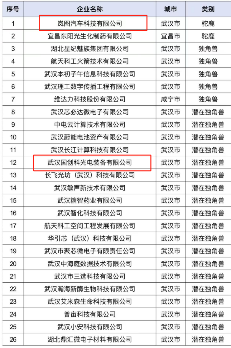 近日,《2024年湖北省科创“新物种”企业名单》发布,入选科创“新物种”企业951家,其中驼鹿企业2家,独角兽企业5家,潜在独角兽企业21家,瞪羚企业923家。湖北产融受托管理的中鑫高投光谷同泽(湖北)产业投资基金投资的岚图汽车科技有限公司,入选2024年湖北省“驼鹿”企业、长江鑫时代鄂州产业投资基金投资的武汉国创科光电装备有限公司入选2024年湖北省“潜在独角兽”企业。