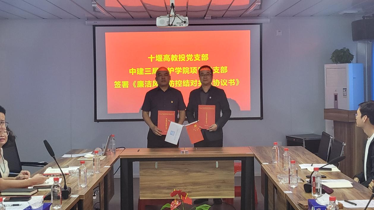 活动中,全体党员诵读党章、重温入党誓词、为党员过“政治生日”。十堰高教投党支部书记丁铱和中建三局药护学院项目党支部书记刘双桥分别领学习近平总书记最新讲话和重要指示批示精神,全体党员围绕领学内容及学习主题开展深入交流研讨,并学习长江产业集团《每月一案》,观看中国建筑廉洁文化理念专题片。双方现场签署了《廉洁共建协议》,就湖北医药学院药护学院新校区建设中加强廉洁务实合作达成一致意见,进一步增强双方廉洁自律意识。