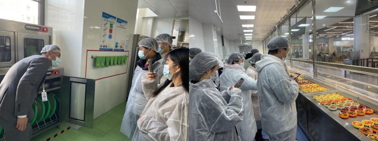 上午10点半,在食堂经理的带领下,老师和学生代表依次参观了食堂更衣区、消毒区、清洗区、配菜区、烹饪区、留样区和储存区,深入了解了食堂的日常运作流程,沉浸式体验了食堂采购验收、储存、烹饪加工及食物留样等各个环节。随后,师生们听取了食堂经理对明厨亮灶系统的介绍,餐饮中心通过远程视频巡查、AI自动抓拍等功能实现对食堂的全方位检查,全闭环监控,有效发挥了“互联网+明厨亮灶”智慧监管平台的功能,为更好督促履行主体责任、实行科学监管提供技术支撑,为实现食品安全共治共享打下坚实基础。1个小时的实地参观,师生们对食堂运作流程有了更详尽的了解,对食堂食品安全及餐厨卫生更加放心、认可。