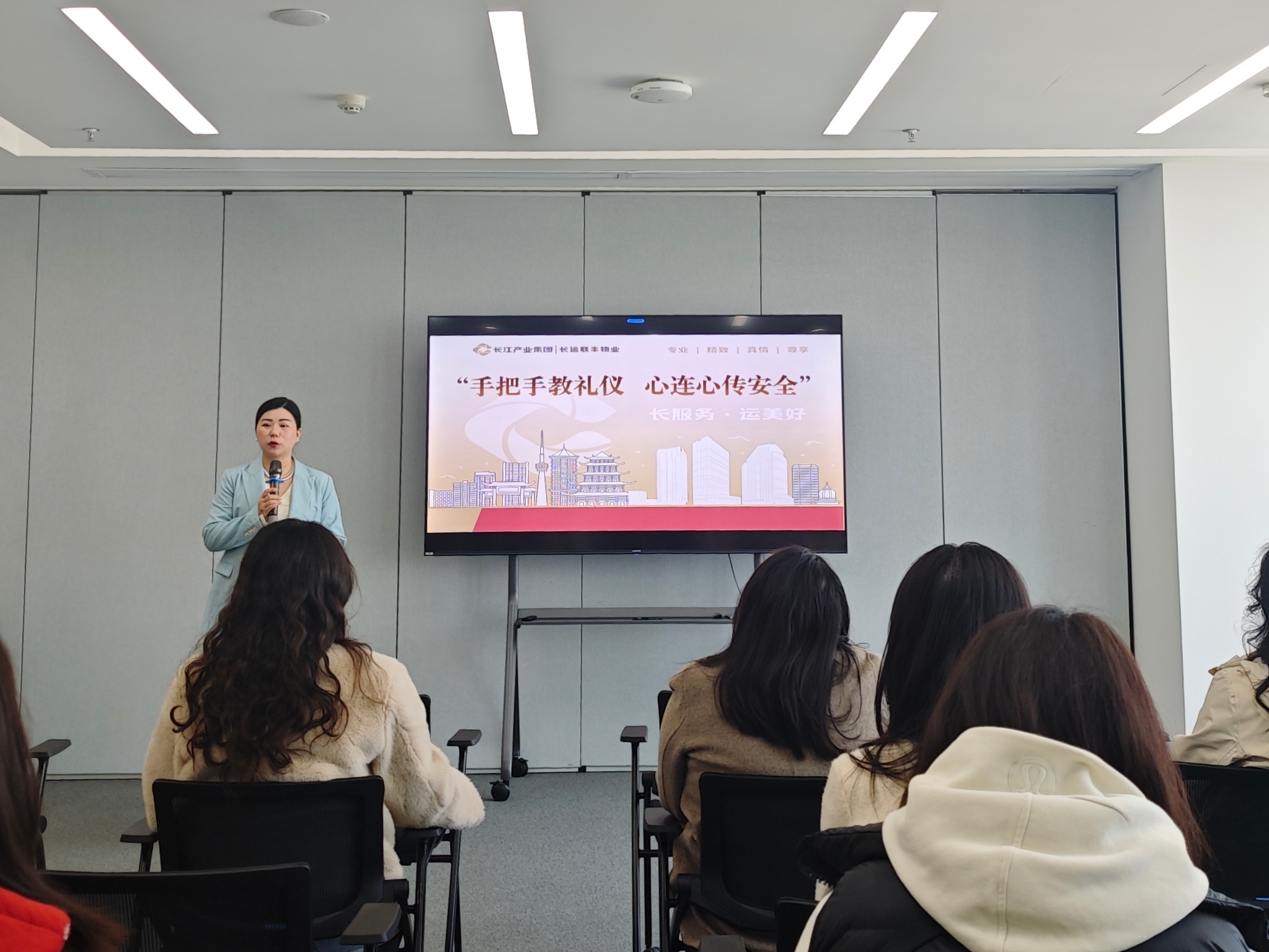 在培训的第一部分聚焦于职场礼仪方面,由长运联丰物业客服经理胥亚莉主讲。胥经理以《职场礼仪三部曲——形象、接待与会议》为主题,系统解析了职场中得体的仪容仪表,通过目光微笑法等趣味互动,帮助员工掌握自然得体的微笑技巧。她重点示范了“丁字步站位”“曲臂式引导手势”等标准动作,参训员工集体接受了站姿、坐姿及鞠躬礼仪的标准化训练。此外,主讲老师还通过情景模拟演示了桌牌摆放原则及茶水服务操作规范。