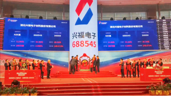 1月22日,长江产业集团旗下母基金参股多支基金投资的湖北兴福电子材料股份有限公司(简称“兴福电子”,股票代码:688545.SH)成功在科创板挂牌上市,成为2025年度湖北省首家A股上市企业。本次发行募集资金总额11.68亿元,发行价11.68元/股,首日收盘价27.39元/股,涨幅134.5%。