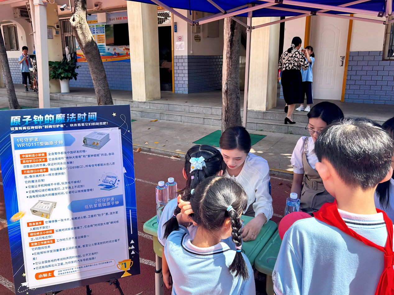 活动现场设置的科普展板区同样引人驻足。展板图文并茂的展示原子钟相关知识,科普团成员结合展板和课堂内容发起互动问答,孩子们围在展板前展开思辨,不少人掏出笔记本认真记录知识点,现场洋溢着浓厚的求知氛围。