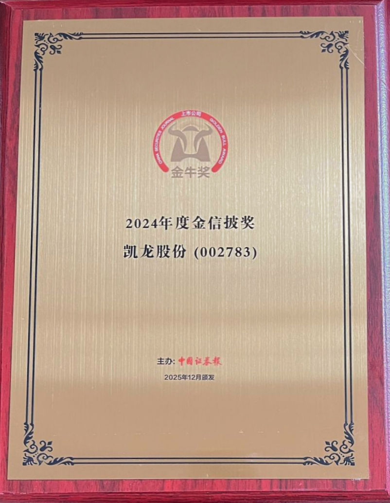 12月6日,由中国证券报主办的“双创融合 智启新程——2025科创投资大会”暨上市公司金牛奖(金信披奖)颁奖典礼在安徽省合肥市隆重举行。凯龙股份凭借在公司治理、信息披露、投资者关系管理等方面的优异表现,荣获金牛奖“金信披奖”殊荣。