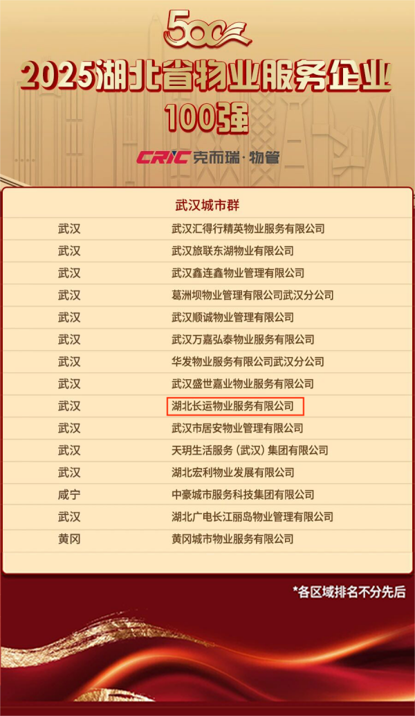 1月23日,在克而瑞物管发布的“2025湖北省物业服务企业综合实力研究成果”中,长运物业以实力入选“2025湖北省国有物业服务企业30强”及“2025湖北省物业服务企业100强”榜单,区域标杆地位与国企引领作用获行业权威认可。