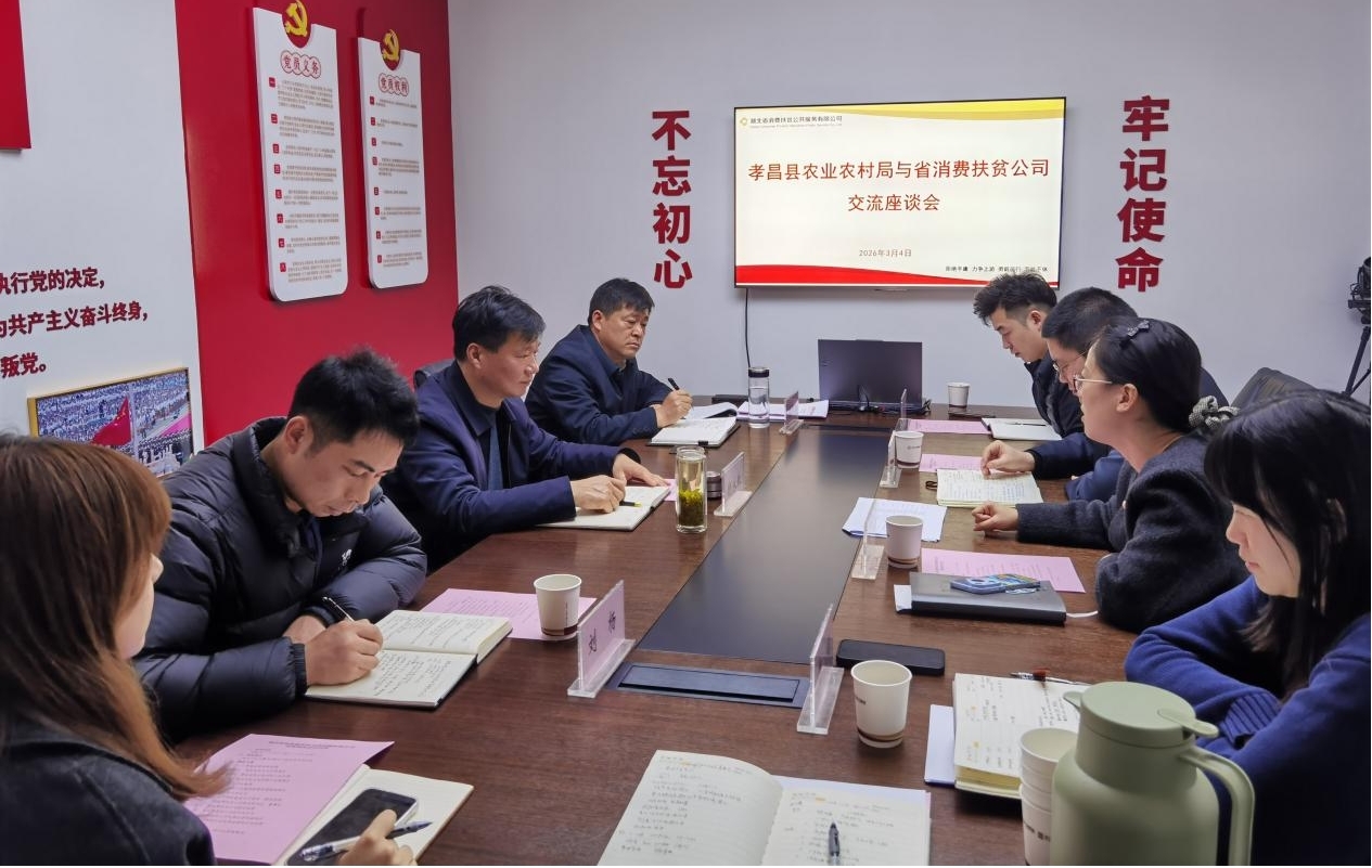3月4日,一场聚焦产业振兴的政企协作座谈会在湖北省消费扶贫公司举行。孝昌县农业农村局与省消费扶贫公司达成系列实质性合作共识,双方将围绕孝昌“四大特色产业”构建全产业链合作机制,依托省级消费帮扶平台,为当地优质农产品打通从田间到餐桌的“快车道”。孝昌县农业农村局党组书记、局长饶永红,长江产业集团投资管理部副部长李婧,省消费扶贫公司党支部书记、董事长胡皓中,业务总监许嘉乐等参与洽谈。