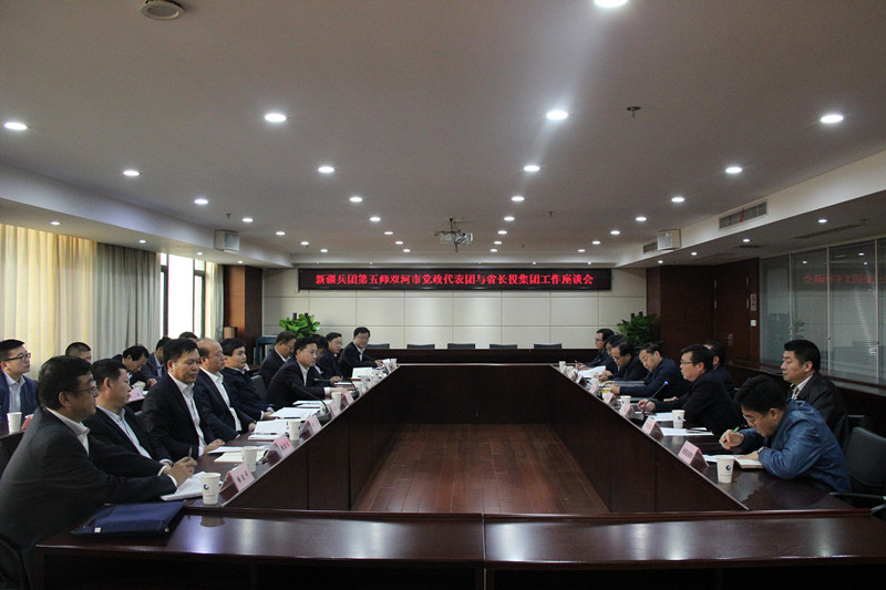 五师双河市黄鑫、赵芝斌、桂东风、任昆峰、杨世平、翁振林、张兵、吴飞鹏、司志伟等领导,省发改委援疆办调研员王安荣,省长投集团总经济师杜三湖和综合办公室主任、投资发展部、农机公司负责人参加会议。