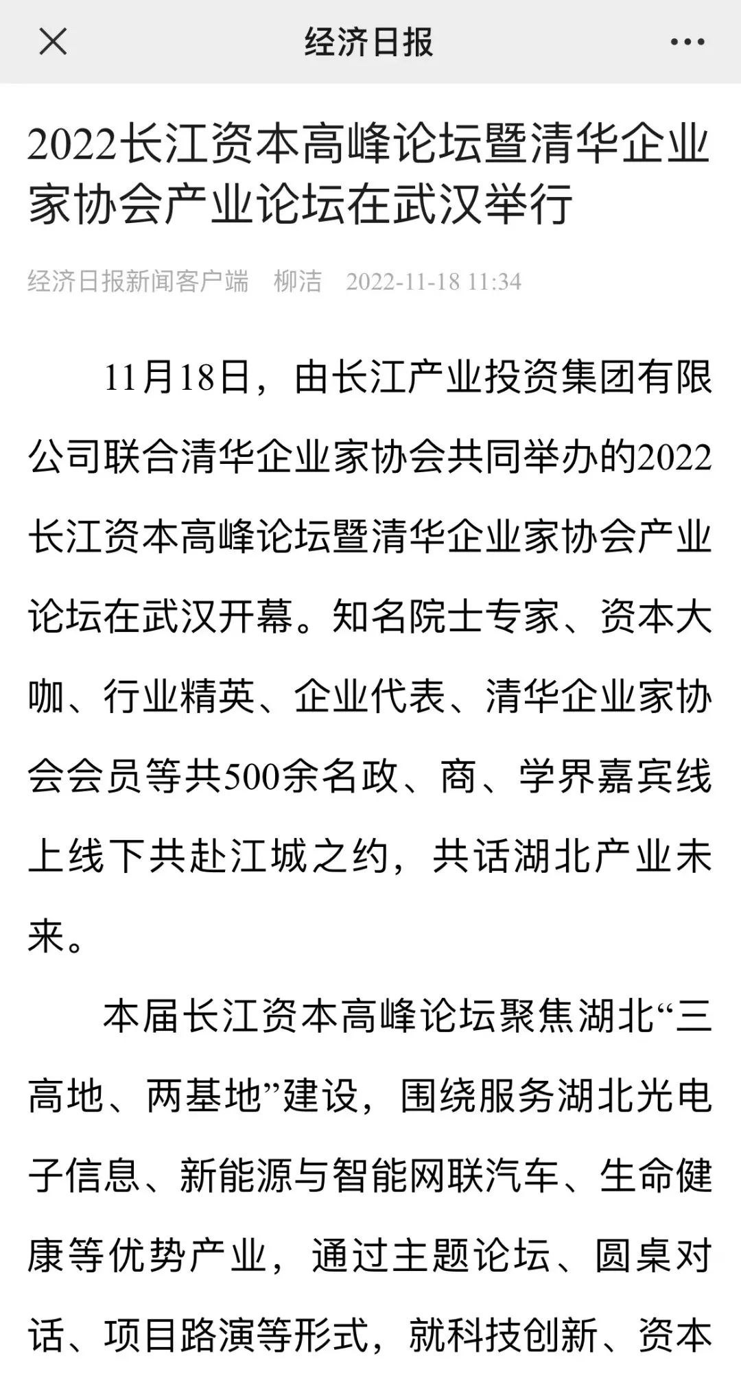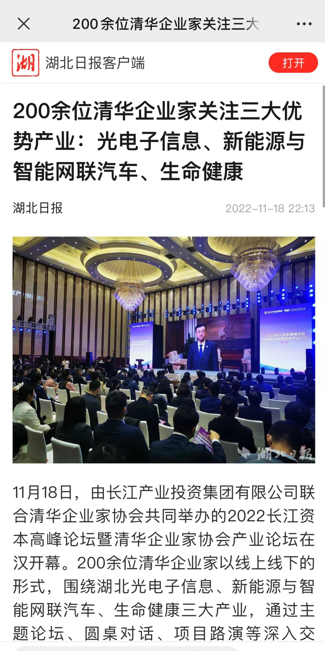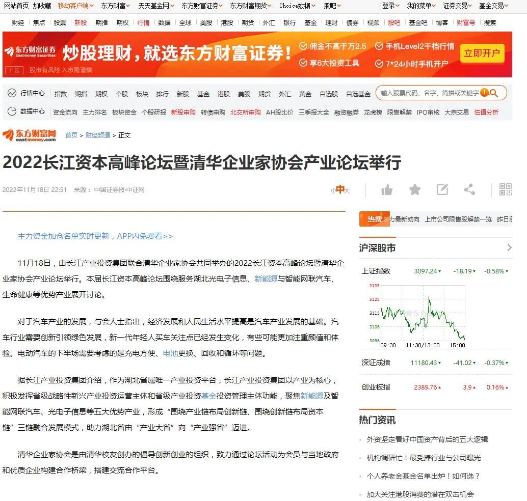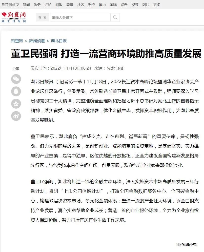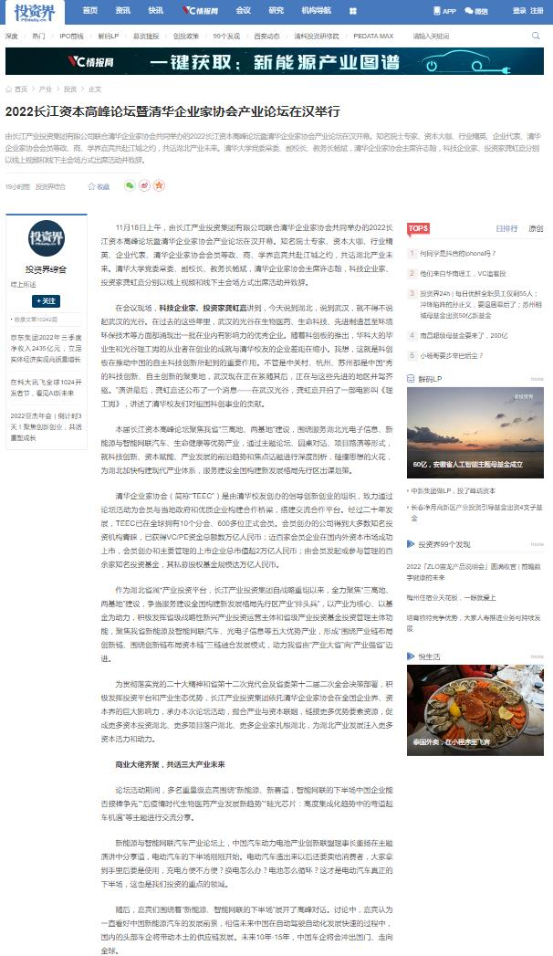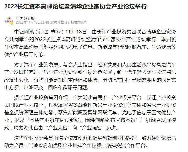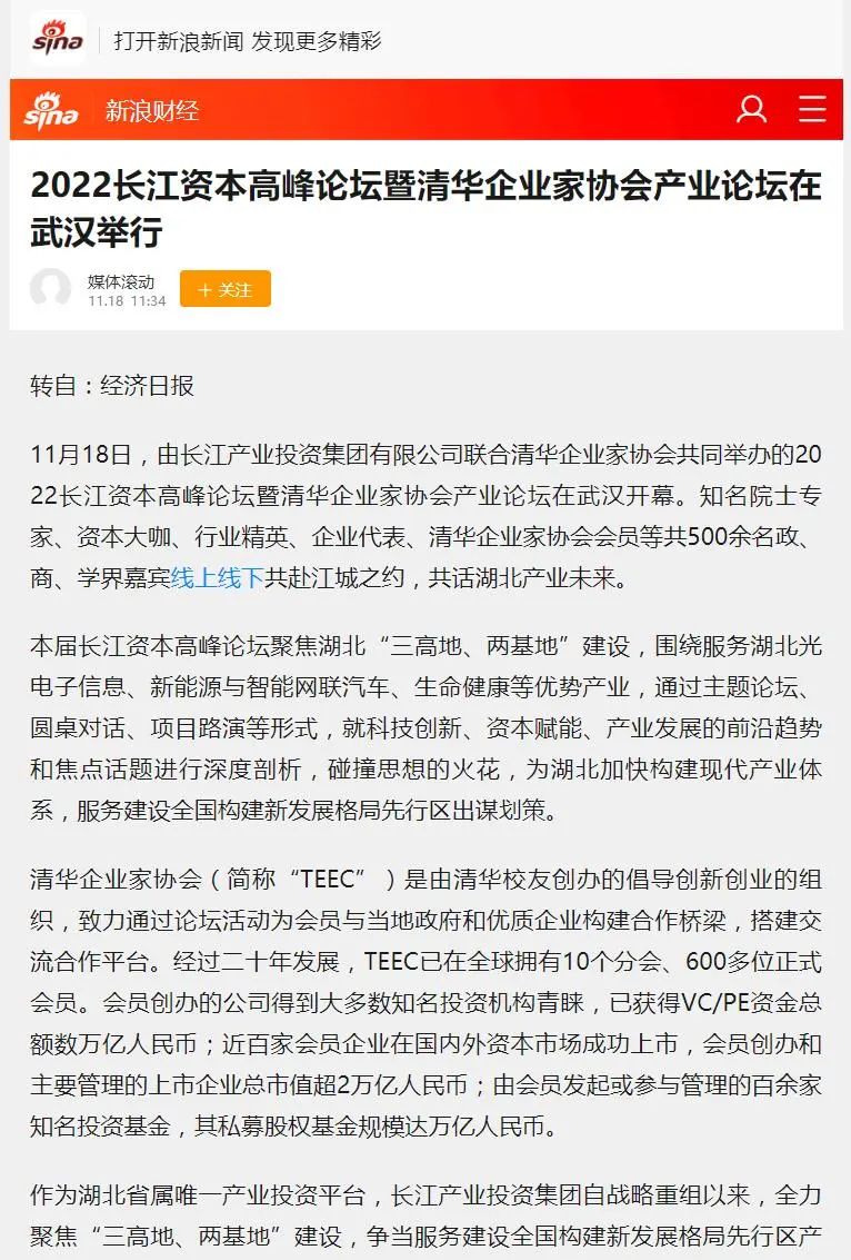 11月18日,2022长江资本高峰论坛暨清华企业家协会产业论坛在汉开幕,新华社、经济日报、中国证券报、湖北日报、长江云、荆楚网、投资界、中国商报网、网易、新浪网、今日头条等多家中央、地方、行业媒体竞相对活动进行了报道。