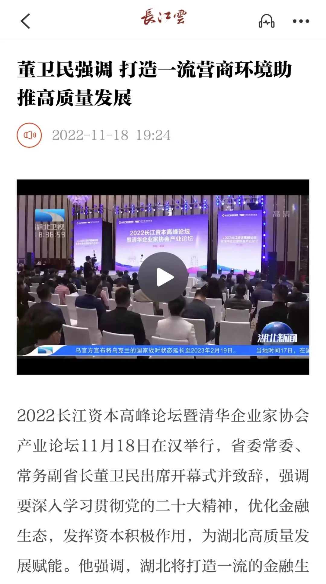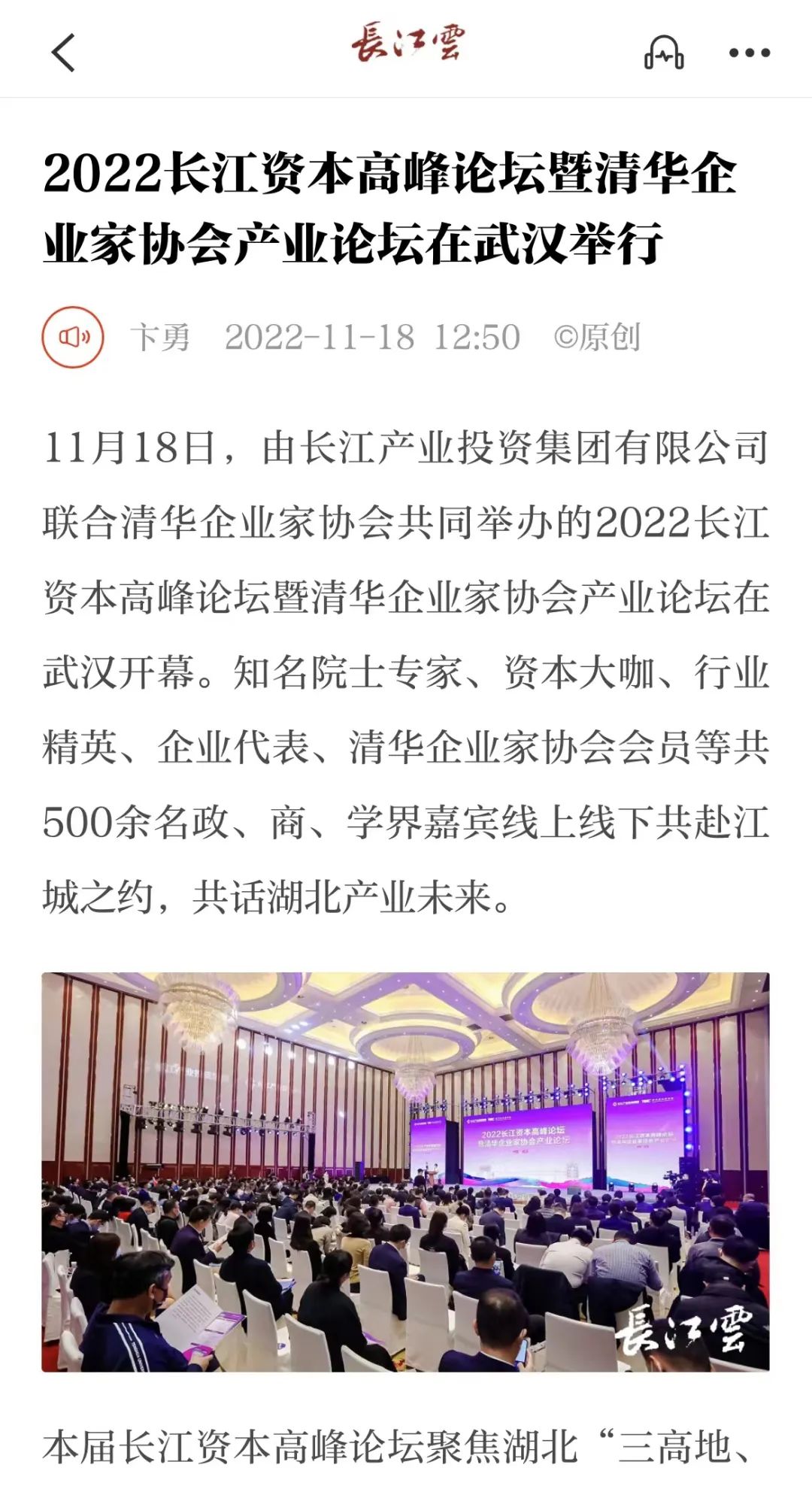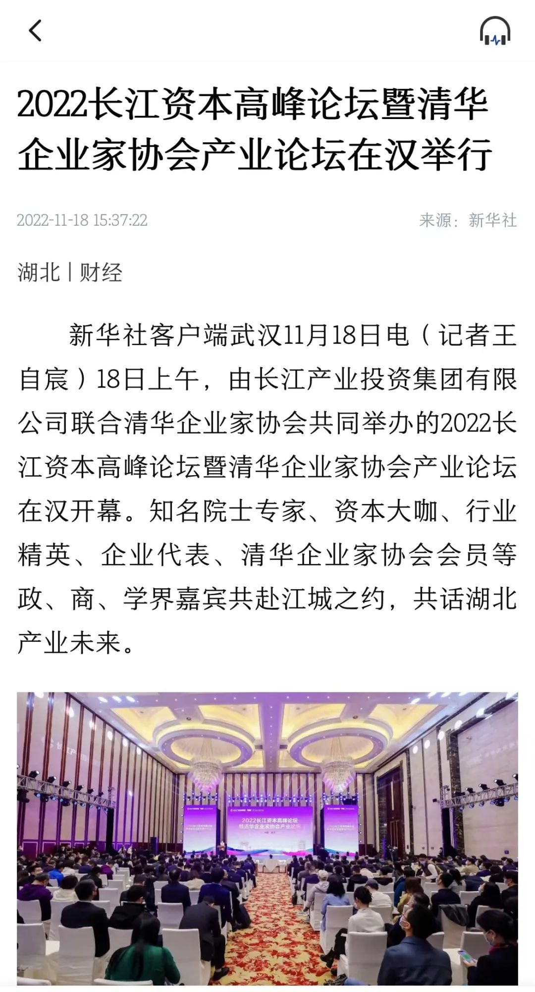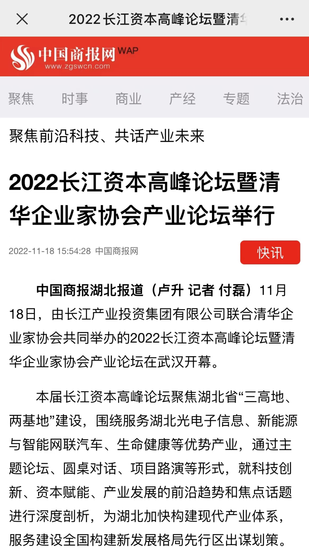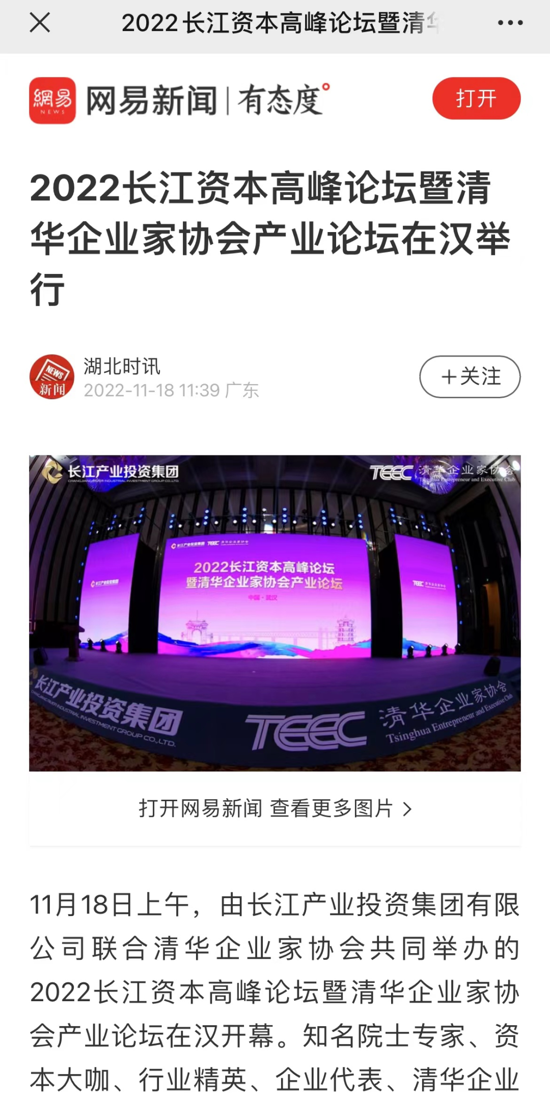 11月18日,2022长江资本高峰论坛暨清华企业家协会产业论坛在汉开幕,新华社、经济日报、中国证券报、湖北日报、长江云、荆楚网、投资界、中国商报网、网易、新浪网、今日头条等多家中央、地方、行业媒体竞相对活动进行了报道。