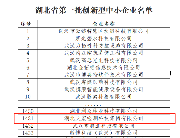12月8日,湖北省经济和信息化厅发布湖北省第一批创新型中小企业名单,湖北生态旗下天宏检测公司以专业的技术研发能力、突出的科技创新实力成功入选。