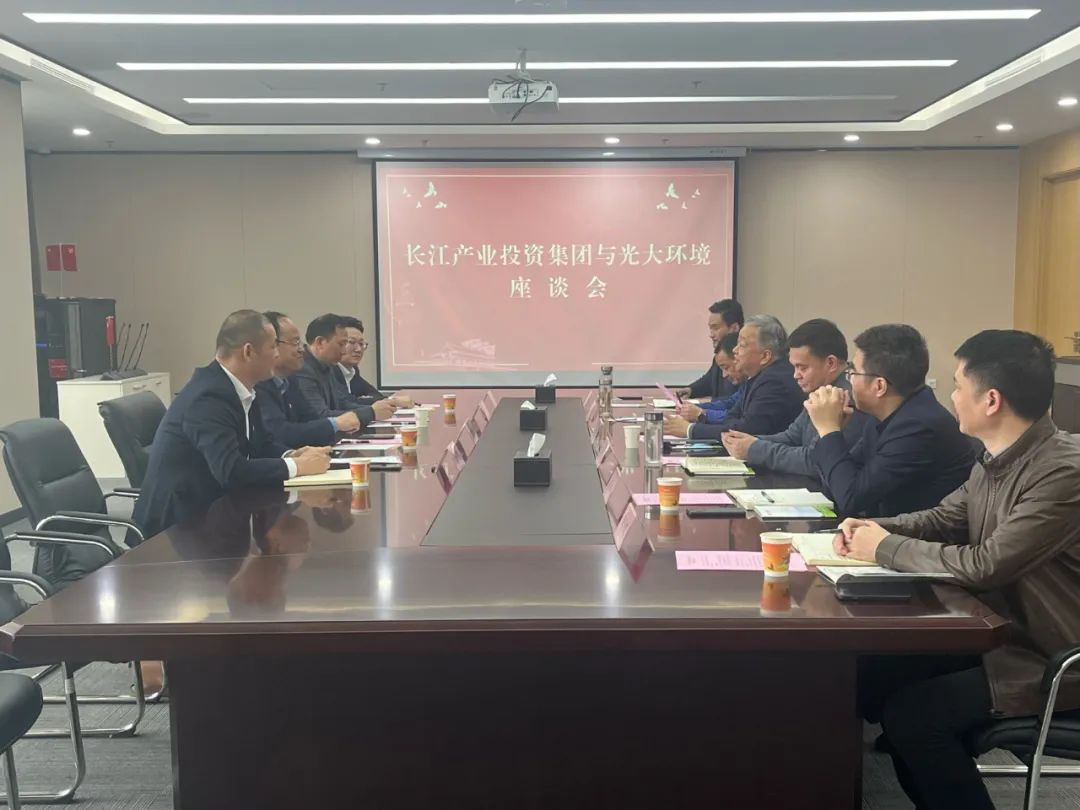 近日,中国光大环境(集团)有限公司副总裁杨仕桥一行到访长江产业集团,与集团党委副书记、总经理黎苑楚就进一步深化合作开展座谈交流。集团党委委员、副总经理董志发参加座谈。