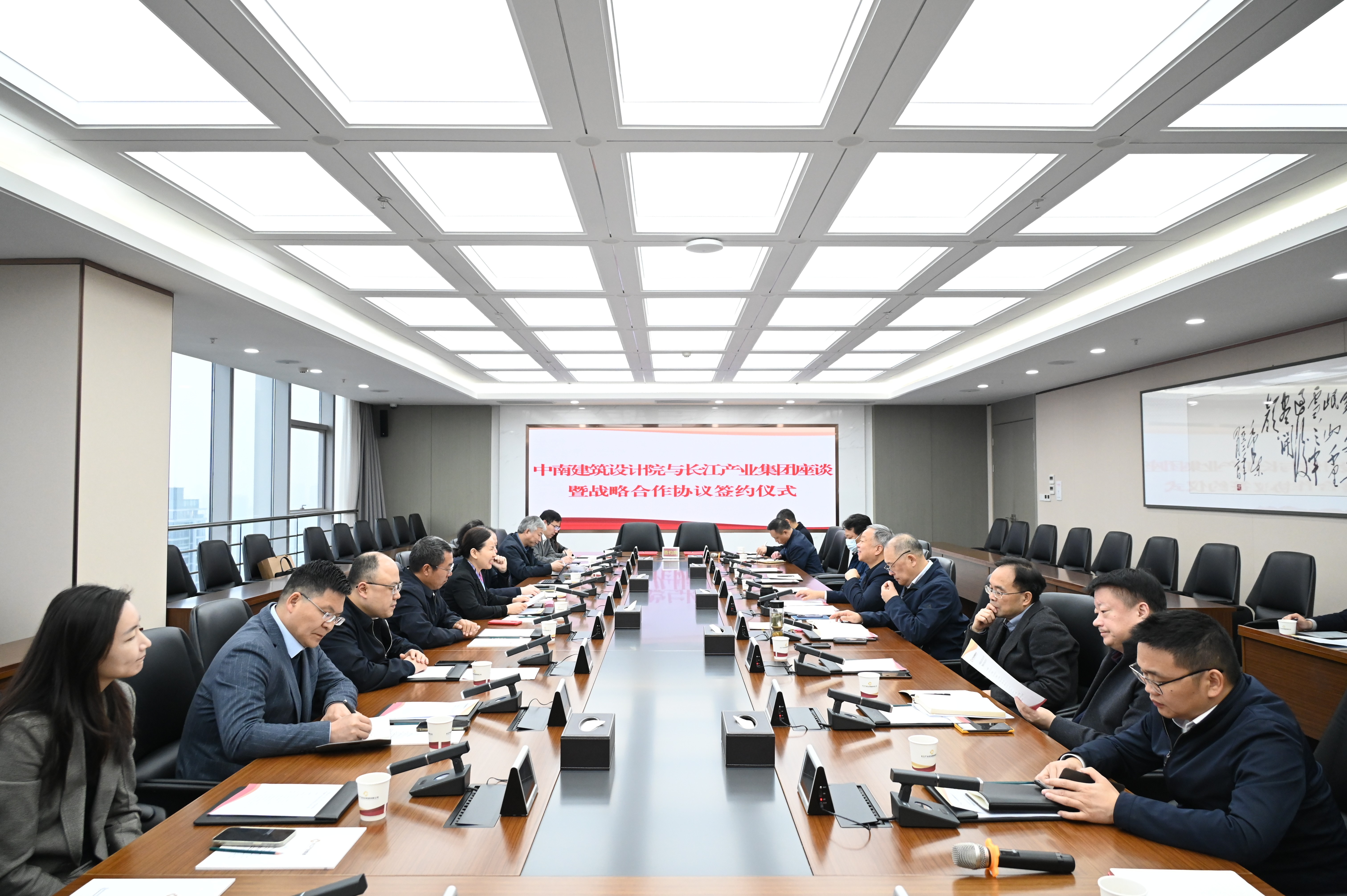 中南建筑设计院党委委员、副总经理胡曙海,长江产业集团党委委员、副总经理孙群,运营总监杜三湖出席活动。中南建筑设计院战略发展部、EPC事业部、生态环境事业部、基础设施事业部、建筑设计事业部、营销管理委员会负责人;长江产业集团综合办公室、战略规划部、运营管理部、投资管理部,长江投开、长江运营、湖北教投、湖北典策、长江北斗、万润半导体负责人参加签约仪式。