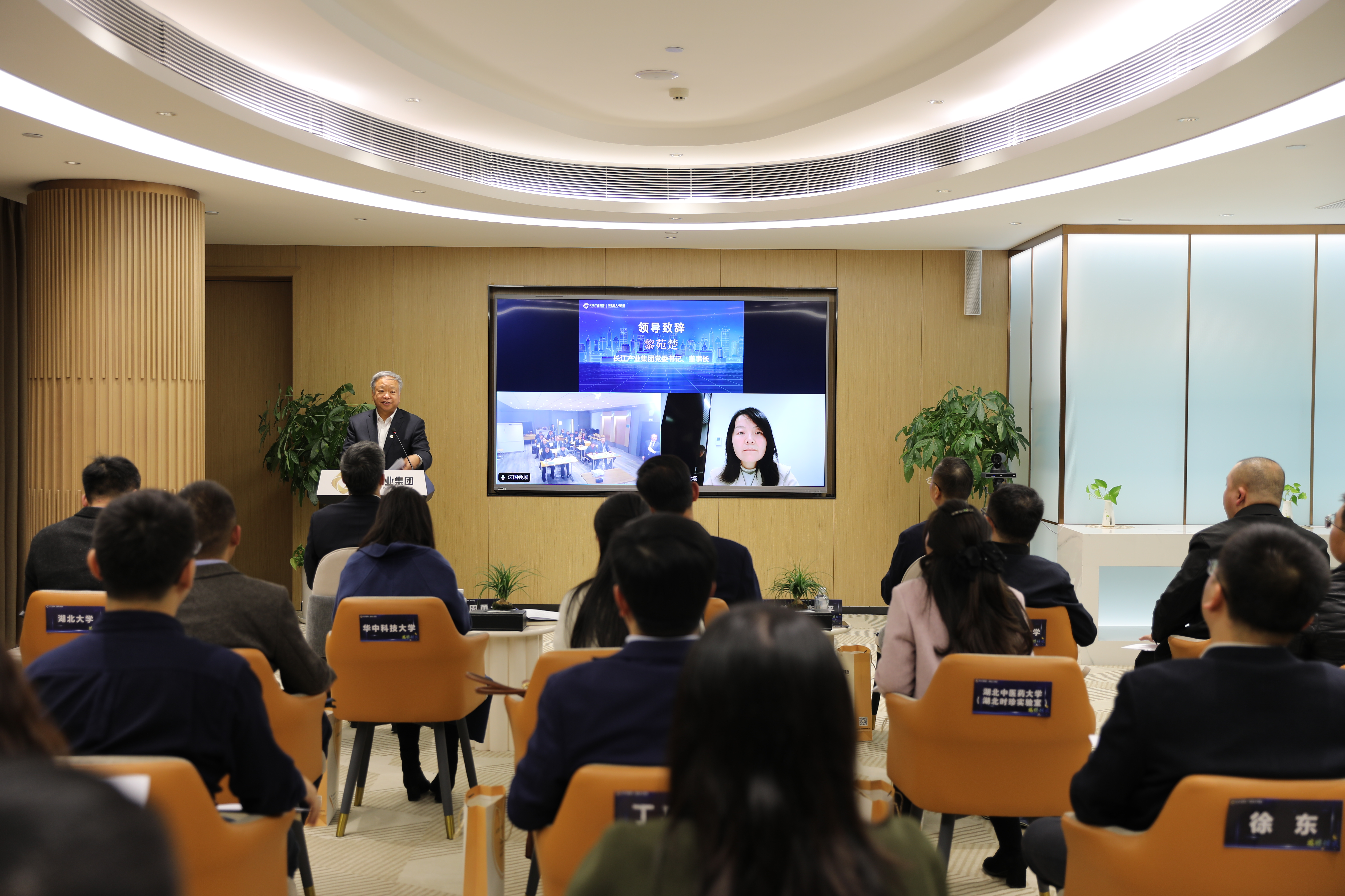 中国贸促会驻法国代表处副总代表李文国,中国银行巴黎分行行长、法国中国工商会会长肖亮,中远海运法国公司总经理唐星球等有关企业、社团组织代表近二十人出席法国巴黎会场揭牌仪式。武汉大学、华中科技大学、武汉理工大学、湖北大学、长江大学、武汉工程大学、武汉纺织大学、湖北中医药大学、湖北九峰山实验室、湖北江城实验室等省内高校、省级实验室相关负责人;长江产业集团综合办公室、战略规划部(对外联络部)、人力资源部(党委组织部)、长江科服、省人才集团负责人等出席湖北武汉会场揭牌仪式。