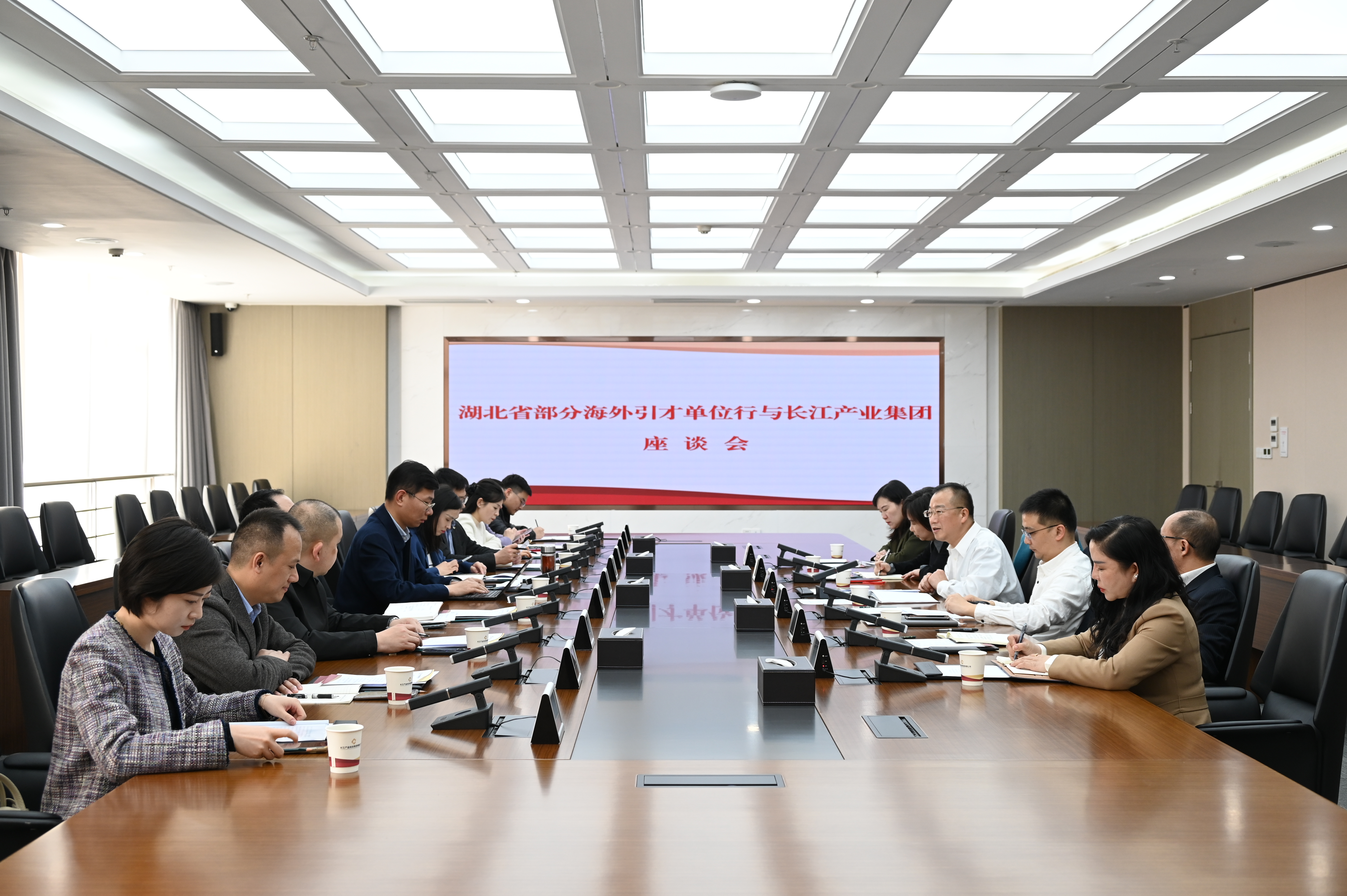 揭牌仪式前,长江产业集团党委委员、副总经理李纪平陪同武汉大学、华中科技大学、武汉理工大学、湖北大学、长江大学、武汉工程大学、武汉纺织大学、湖北中医药大学、湖北九峰山实验室、湖北江城实验室等省内高校、省级实验室相关负责人,参观了集团科技创新展厅和企业文化展厅,并举办以“探索引才新机制,开辟合作新领域”为主题的座谈会。各引才单位代表从不同角度分享了人才“引育用留”方面的宝贵经验、有效举措,并提出建设性意见。
